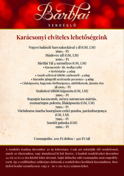 Mindenki szereti a régi ízes magyar ételeket és a kulináris élvezeteket. Ahogy mi is. Ugyanakkor mindannyian egészségesek is szeretnénk maradni és minél kevesebb többletsúlyt felszedni , ezért úgy állítottuk össze mindenkori menüajánlatainkat , hogy a nálunk vendégeskedők nemcsak jó kulináris élményekkel, kellemes hangulatban , de az egészségük megőrzése szempontjából is jóleső nyugalommal távozzanak a Bártfaiból , hogy mielőbb újra visszatérjenek! Úgy véljük, hogy a legmagasabb színvonalat magyaros konyhával, csak hazai beszállítókkal lehet biztosítani, így nemcsak a zöldségeket, de a húsokat is közvetlenül a kisgazdaságodtól szerezzük be ahol ellenőrzött és lekövethető az állatok takarmányozása és tartása.